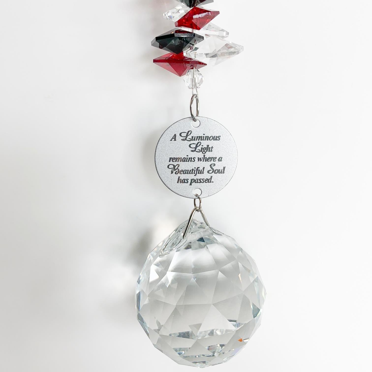 The Wishing Thread Eternity Crystal – Cardinal is a 12-inch faceted suncatcher inspired by the Roman Goddess Aeternitas, designed to sparkle in sunlight and symbolize hopes, dreams, and transformation.