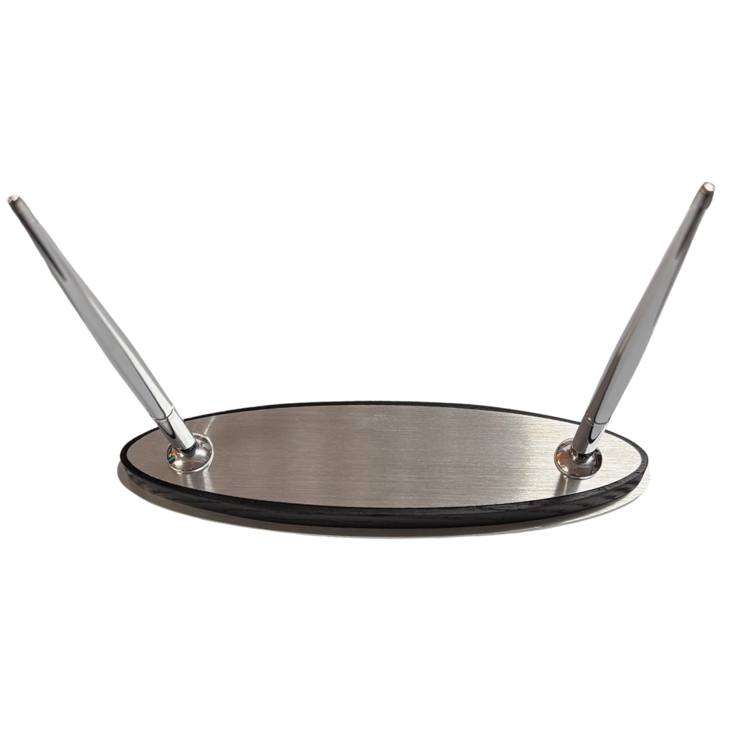 Add a touch of elegance to any desk with this double silver pen set, featuring two silver pens with smooth black ink displayed on a sleek silver and black oval base. The base can be engraved for a personalized finish, making this set a perfect gift for graduations, retirements, weddings, corporate events, or special occasions. Stylish and functional, it’s ideal for offices, reception desks, or home workspaces.