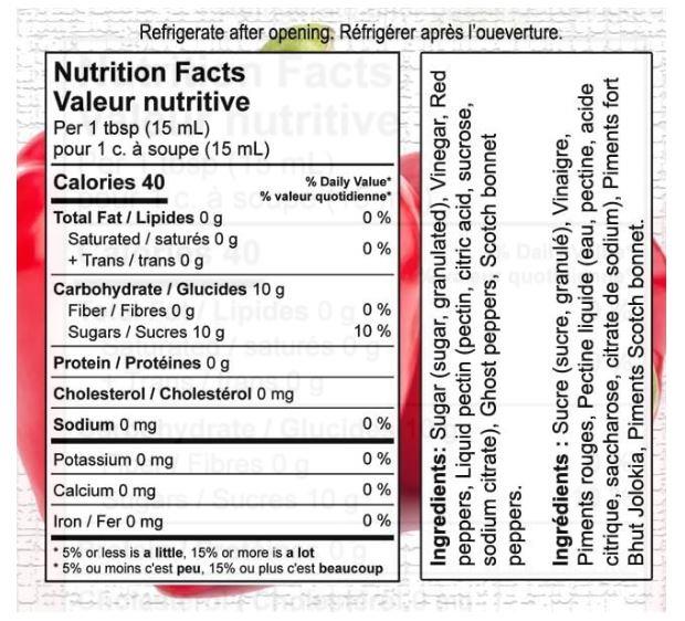 Ingredients: Sugar, Vinegar, Red Peppers, Liquid Pectin(Water, pectin, citric acid, sodium citrate, Ghost Peppers, Scotch Bonnet Peppers.