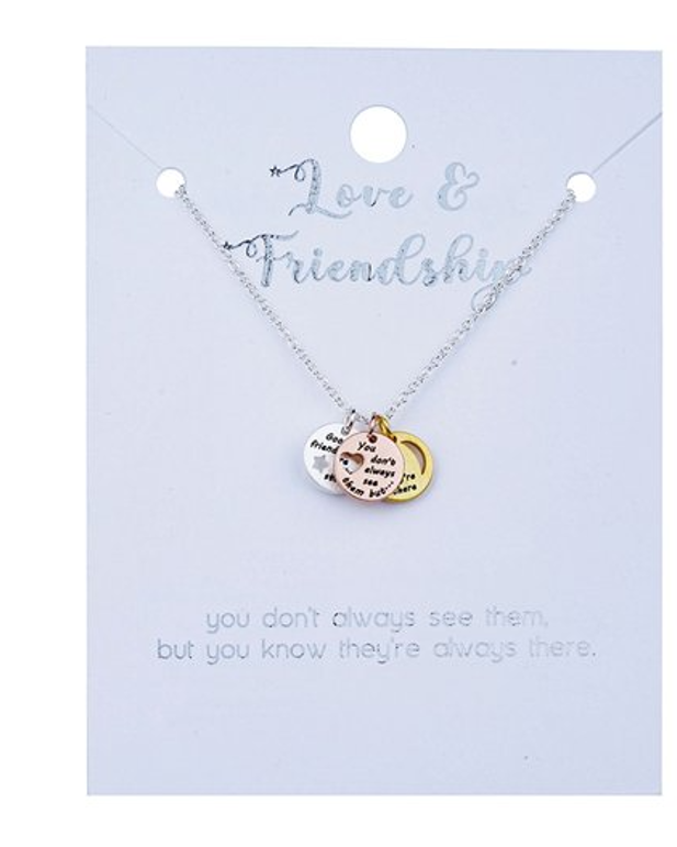 Celebrate the gift of friendship with this silver-tone necklace featuring three meaningful circle charms. Each charm carries part of a heartfelt message: “Good friends are like stars”, “You don’t always see them but…”, and “You always know they are there.” Crafted from non-allergenic metals, this necklace makes a thoughtful gift for a best friend or a treasured reminder of lasting bonds. The chain is adjustable to 16", 17", and 18" for the perfect fit.