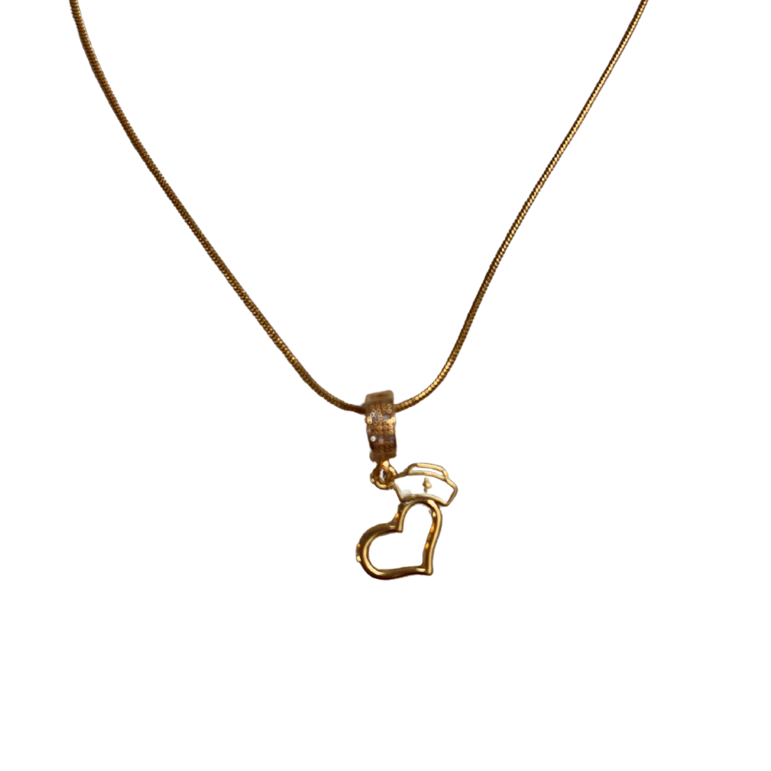 Gold-tone necklace featuring a heart pendant with a white enameled nurse’s cap. The pendant hangs from a crystal-encrusted bail on an 18" snake chain.