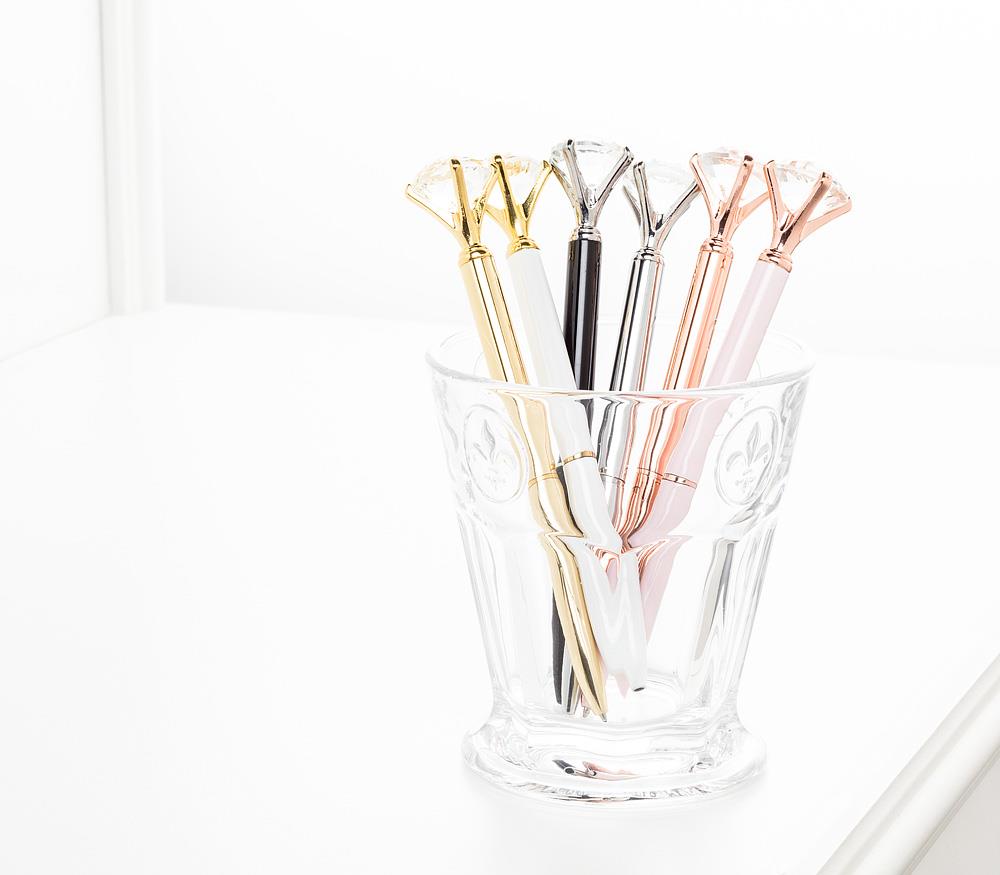 Elevate your handwriting with this sleek and stylish pen, accented with a clear gem on top. Crafted out of stainless steel and glass, this elegant writing tool in black is the perfect complement to your more stylish stationery.