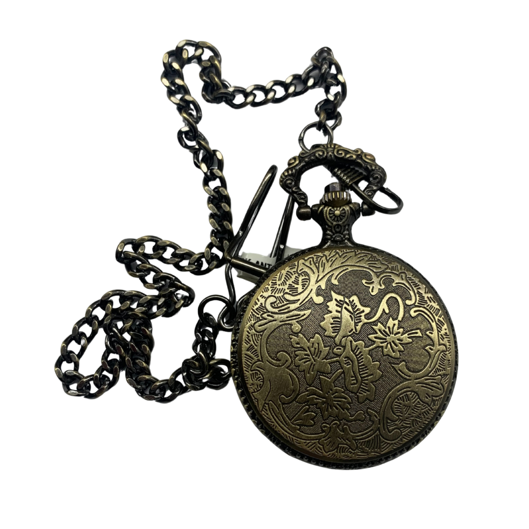 Add timeless charm to your collection with this antique gold pocket watch featuring a beautifully embossed truck and tree design on the front cover. Crafted with a vintage finish, this piece blends rustic character with everyday practicality. The watch includes a matching chain and secure clip for effortless styling—perfect for pockets, bags, or display.