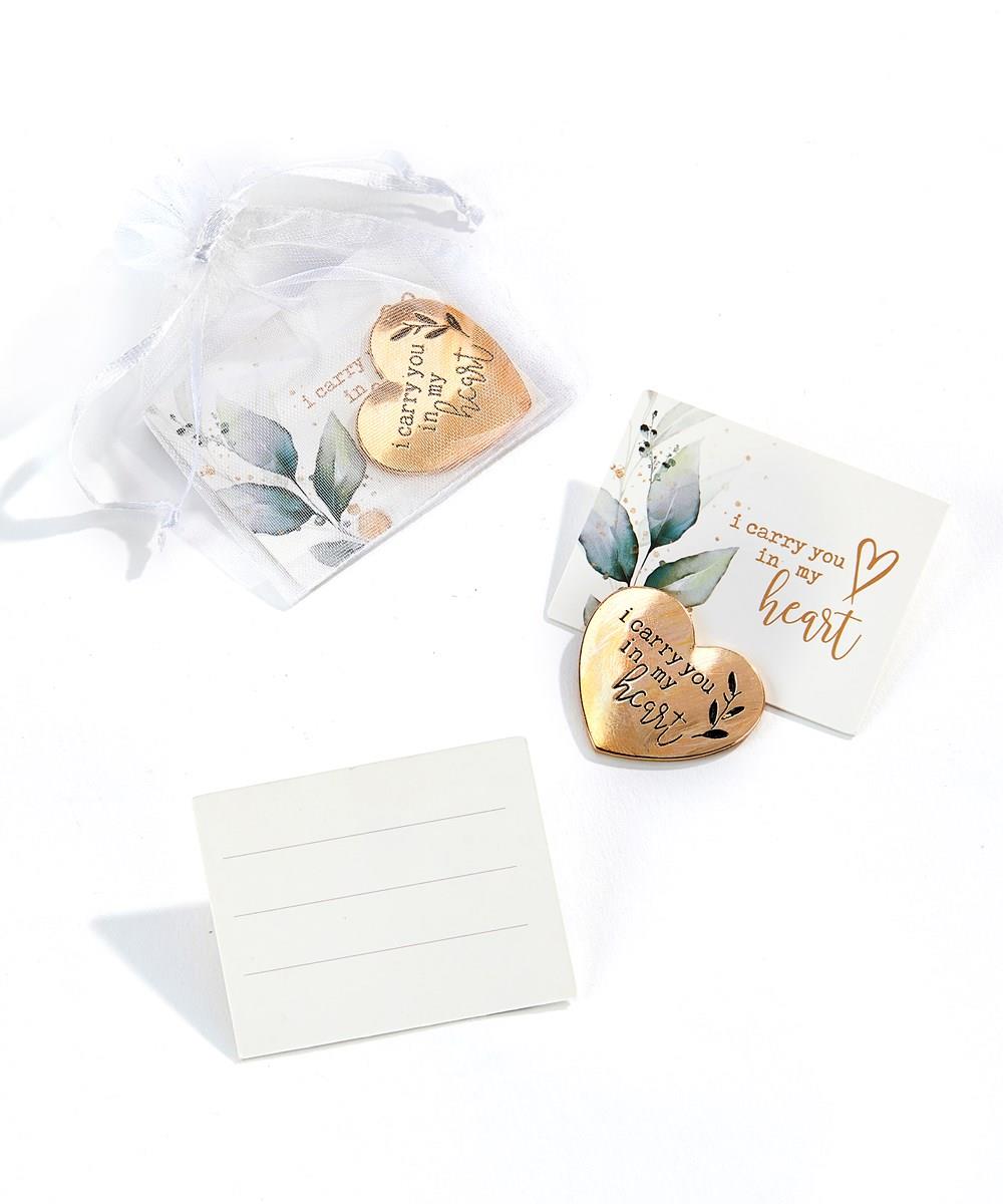 Let someone know you're thinking of them with the sentiment "I carry you in my heart", found on both the gold heart token and the front of a card with a leaf design.
