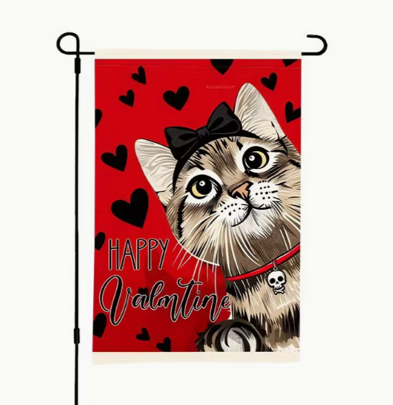Add a touch of adorable charm to your Valentine’s décor with this satin-finish garden flag. Measuring 12" x 18", it features a sweet kitten design surrounded by hearts, perfect for spreading love and cheer. Ideal for porches, gardens, or outdoor spaces, this festive flag makes a delightful gift for cat lovers or anyone who enjoys whimsical Valentine’s decorations.