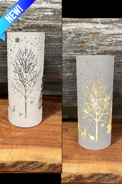 This festive glass piece glows beautifully, featuring reindeer and trees illuminated from within. Sized at 3.5" x 6", it’s battery operated (requires 3 AAA batteries, not included) and includes a convenient timer function for effortless holiday charm.